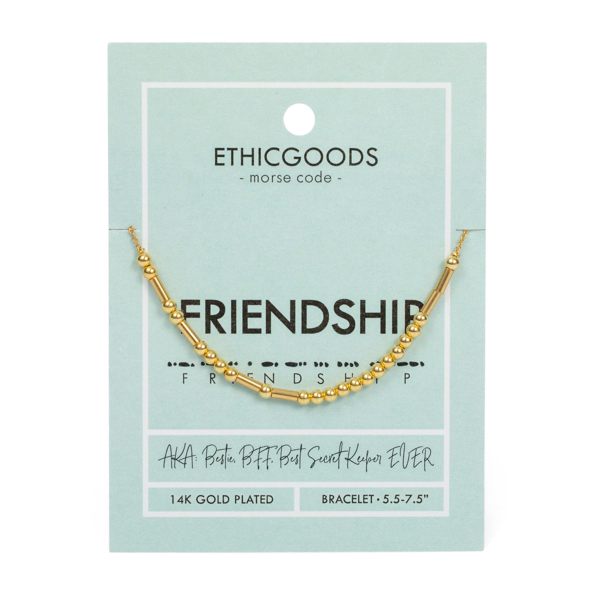 This timeless Morse Code Beaded Bracelet is the perfect way to accessorize your wardrobe. Handmade with 14k gold plated beads and chain, this classic piece is a wardrobe staple that carries a meaningful message. The beads are arranged in a series of dots and dashes that spell empowering words in Morse Code. Which word will you choose? We’d love to hear what your jewelry means to you. Share your story and photos with us! @ethicgoods