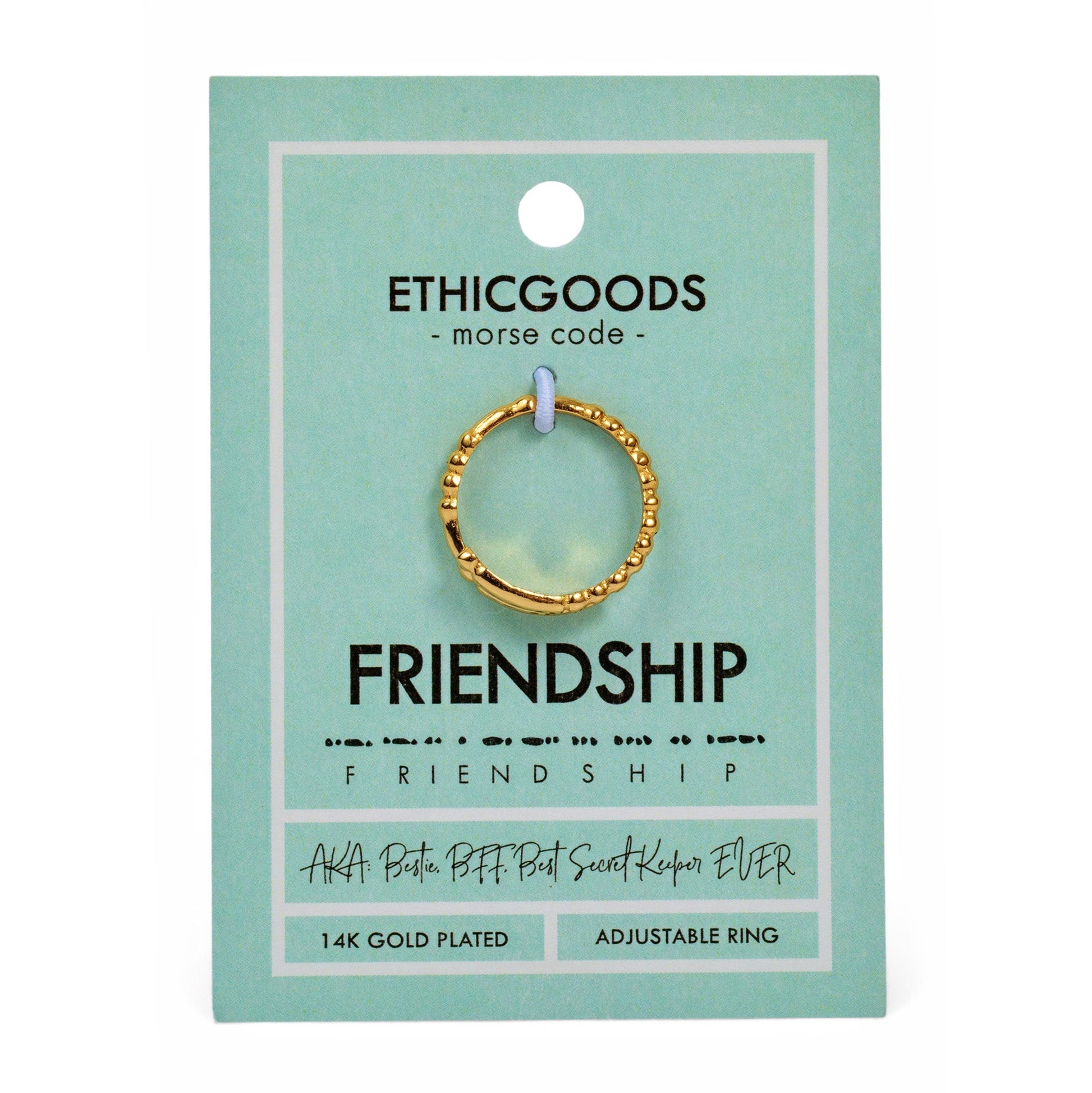Take your style up a notch with this unique Morse Code Ring! Crafted from 14k gold-plated metal and designed in a morse code pattern, this adjustable ring will make a statement. Uncover the hidden meaning behind the design and show that you care with this ethically handmade peice. Each ring has the Morse Code pattern on the outside and the word inside. What word will you choose? We’d love to hear what your jewelry means to you. Share your story and photos with us! @ethicgoods