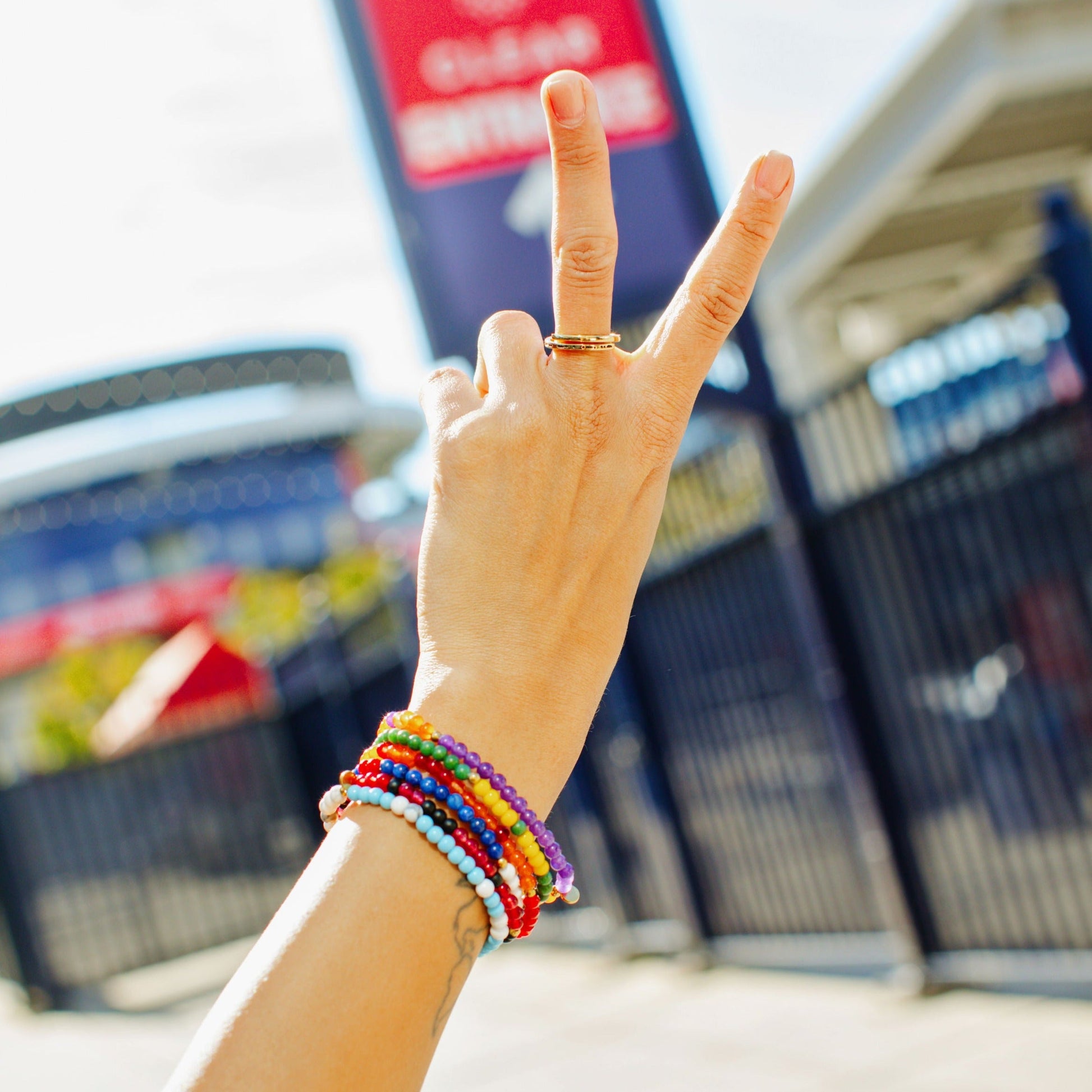 How to read your jewelry: A Morse Code dot is one bead and a dash is two beads in the alternating colors. Start at the small gold spacer bead and follow the Morse Code spelling around the bracelet!