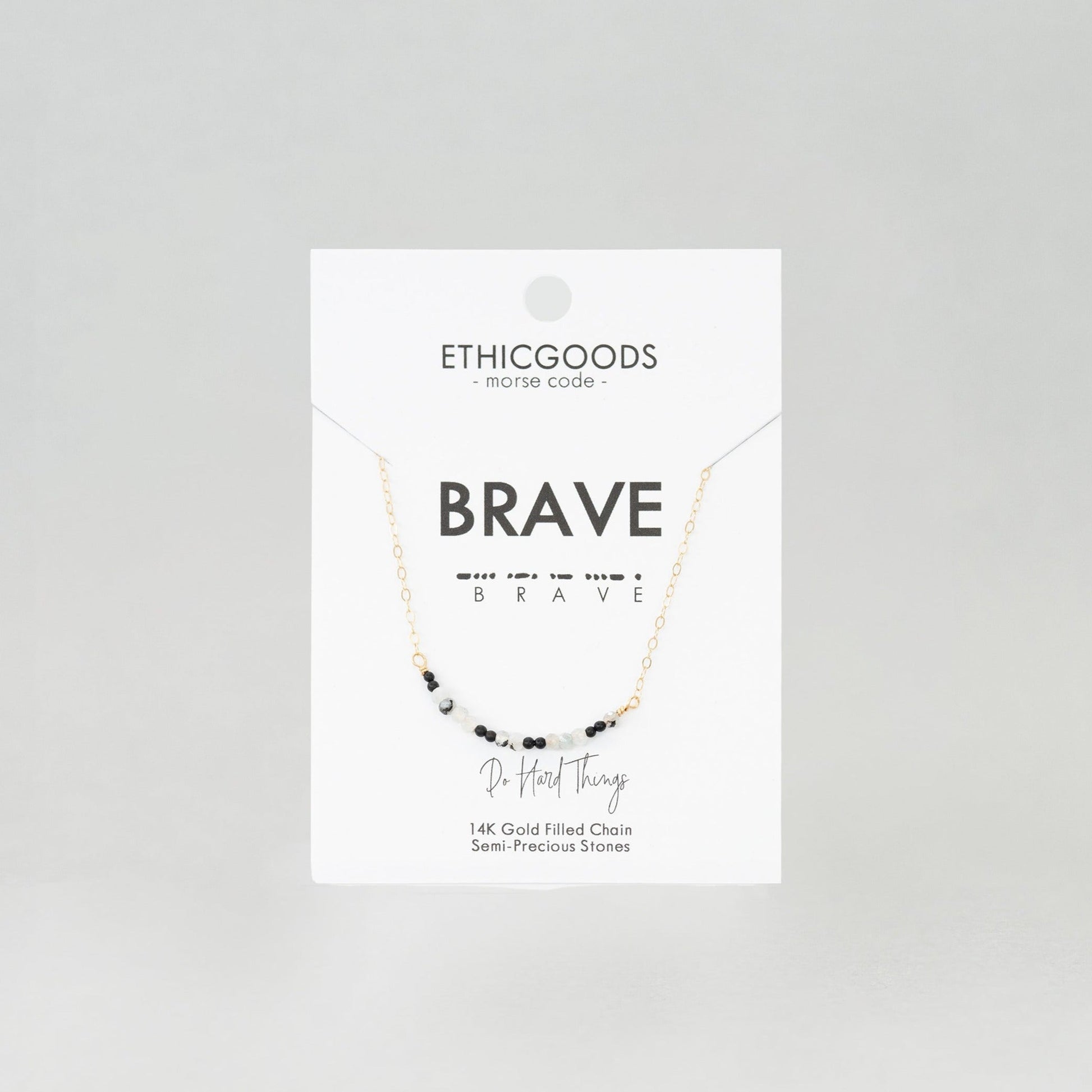 This 14k gorgeous, dainty gold-filled necklace spells BRAVE in Morse Code. It’s perfect to wear every day layered with other necklaces or as a stand alone piece!  Wear it to put on courage. Bravery is doing hard things even when you're afraid. What have you been brave for? We’d love to hear what your jewelry means to you. Share your story and photos with us!  @ethicgoods