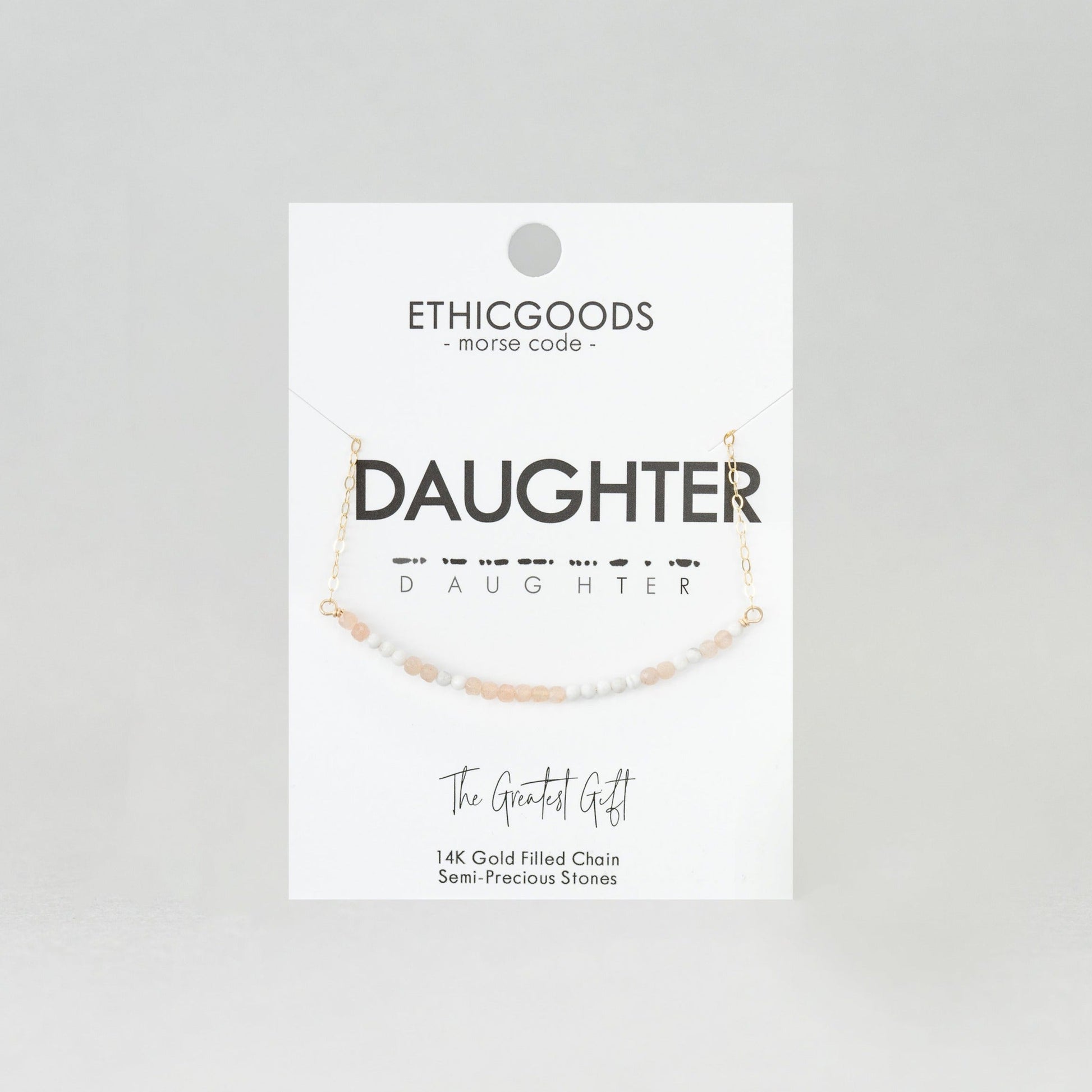 This 14k gorgeous, dainty gold-filled necklace spells DAUGHTER in Morse Code. It’s perfect to wear every day layered with other necklaces or as a stand alone piece!
